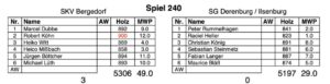 Erneut legten Robert Köhn (894 Holz) und Marcel Dubbe (888 Holz) den Grundstein für den Sieg. Ihre Gegner Christian Krull (840 Holz) und Simon Faber (877 Holz) konnten nur bedingt dagegenhalten.